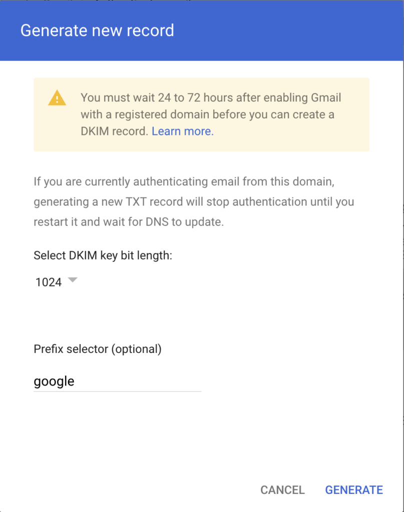 Genereer de DKIM-sleutel in de Google Workspace beheerdersconsole: