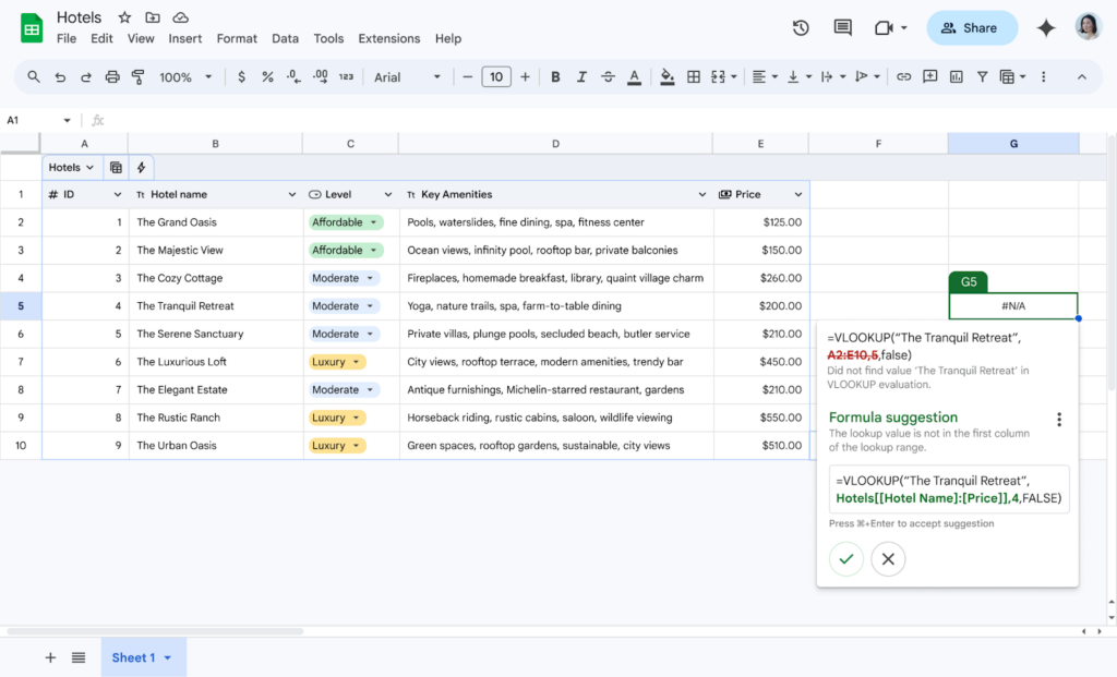 Sheets geeft nu ook suggesties en correcties voor formules met tabel verwijzingen.